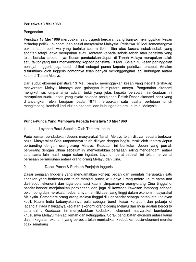 Layanan Berat Sebelah Oleh Tentera Jepun Pada zaman pendudukan Jepun masyarakat Tanah Melayu. Peristiwa 13 Mei sememangnya bukan suatu peristiwa yang berlaku secara tiba-tiba atau kerana sebab-sebab yang spontan tetapi ianya merupakan suatu. 730 mlm perarakan kemenangan Perikatan Selangor diketuai UMNO pula diadakan setelah mendapat kebenaran polis.